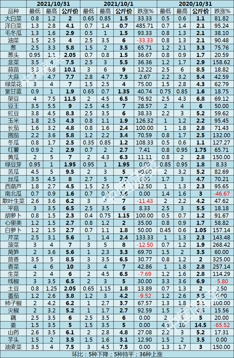 ▲2021年10月31日與10月1日及2020年10月31日常用蔬菜價格對比表(單位:元/公斤)