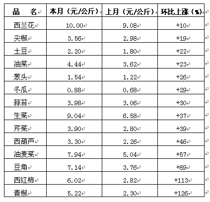 本月價(jià)格上漲幅度大的有14個(gè)蔬菜品種,具體如下: