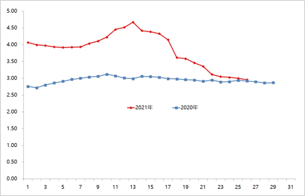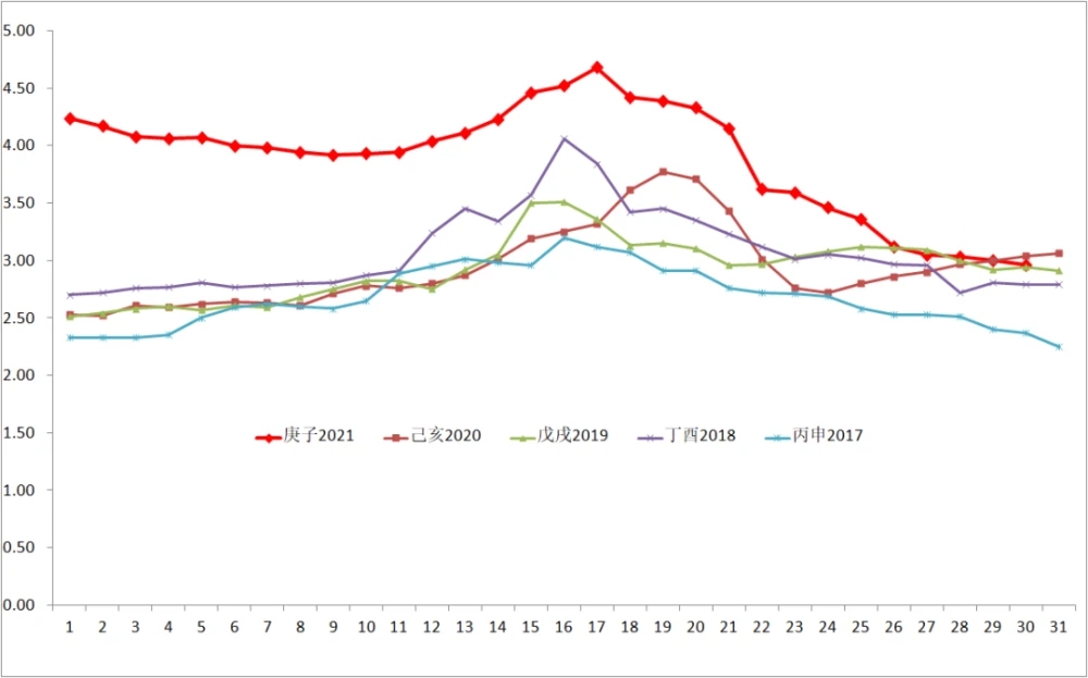 本周末,是農(nóng)歷正月十五,去年同期的價格是3.04元/公斤,同比下降2.63%。上周,價格同比上漲30.07%,本周末同比由大幅上漲轉(zhuǎn)變?yōu)樾》陆怠1局苣?,按照公歷相比,蔬菜的價格比去年同期僅僅上漲了1.37%,而2周前的價格同比是上漲了50.17%。而按照農(nóng)歷正月十五相比,價格甚至還低于去年同期,說明近期蔬菜價格環(huán)比的降幅確實是比較大的。