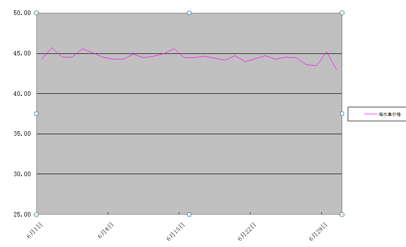 大帶魚、大黃花魚兩種海水魚批發(fā)均價為44.51元/公斤,環(huán)比下降0.3%,同比上升12.2%。