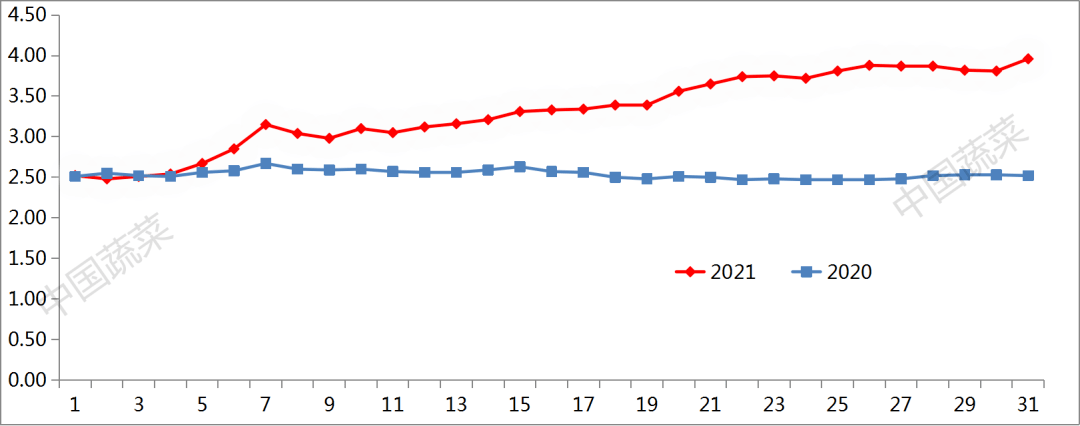 月內(nèi)的最高價是3.96元/公斤(10月31日),月內(nèi)的最低價是2.48元/公斤(10月2日),比9月份的2.26元/公斤上漲9.73%。最高價比最低價高出59.68%,月內(nèi)的最低價出現(xiàn)在月初,最高價出現(xiàn)在月末,說明10月份蔬菜價格整體呈現(xiàn)連續(xù)上漲的態(tài)勢,漲幅巨大。